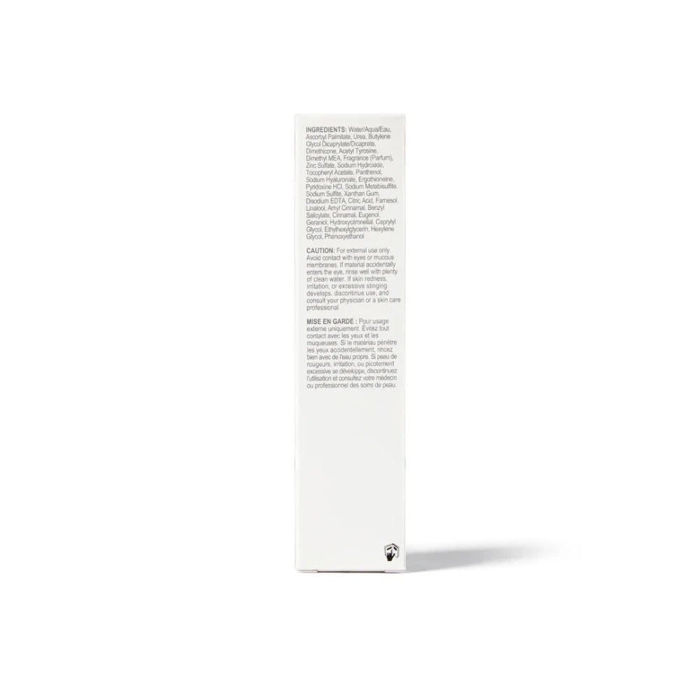 Agua/Agua/Eau, Palmitato de ascorbilo, Urea, Dicaprilato/Dicaprato de butilenglicol, Dimeticona, Acetil tirosina, Dimetil MEA, Fragancia (Parfum), Sulfato de zinc, Hidróxido de sodio, Acetato de tocoferilo, Pantenol, Hialuronato de sodio, Ergotioneína, HCl de piridoxina, Metabisulfito sódico, sulfito sódico, goma xantana, EDTA disódico, ácido cítrico, farnesol, linalol, amil cinamal, salicilato de bencilo, cinamal, eugenol, geraniol, hidroxicitronelal, caprilil glicol, etilhexilglicerina, hexilenglicol, fenoxietanol.